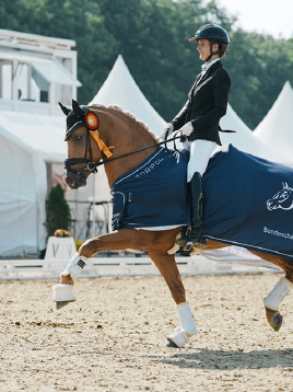 Auch unter dem Reiter bestätigte Der Goldjunge AT NRW seine Qualität eindrucksvoll. Bereits dreijährig gewann er die Sichtungsprüfung zu den Bundeschampionaten mit der Wertnote 8,5. Die Finalqualifikation konnte er mit der herausragenden Wertnote 9,0 für sich entscheiden. Mit der Endnote 8,8 erreichte er im Finale einen ausgezeichneten zweiten Platz und sicherte sich damit den Titel des Vize-Bundeschampions der dreijährigen Reitponyhengste 2024.Im vergangenen Jahr belegte er bei den Bundeschampionaten sowohl in der Einlaufprüfung als auch im Finale jeweils Rang drei und gewann damit die Bronzemedaille der vierjährigen Reitponyhengste.